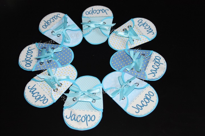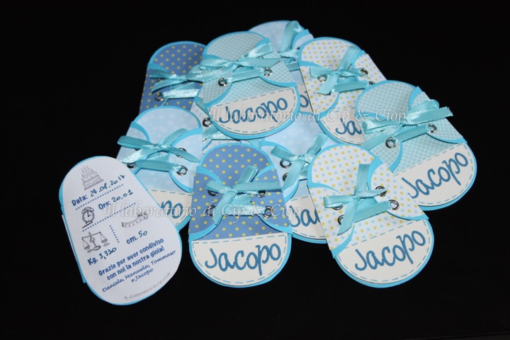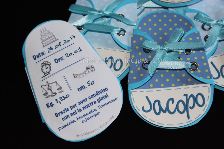 Oggi vi mostro le scarpine che ho preparato per ringraziare tutti coloro che ci sono stati accanto per la nascita del piccolo Jacopo: delle scarpine con tutte le info importanti del nuovo arrivato!!