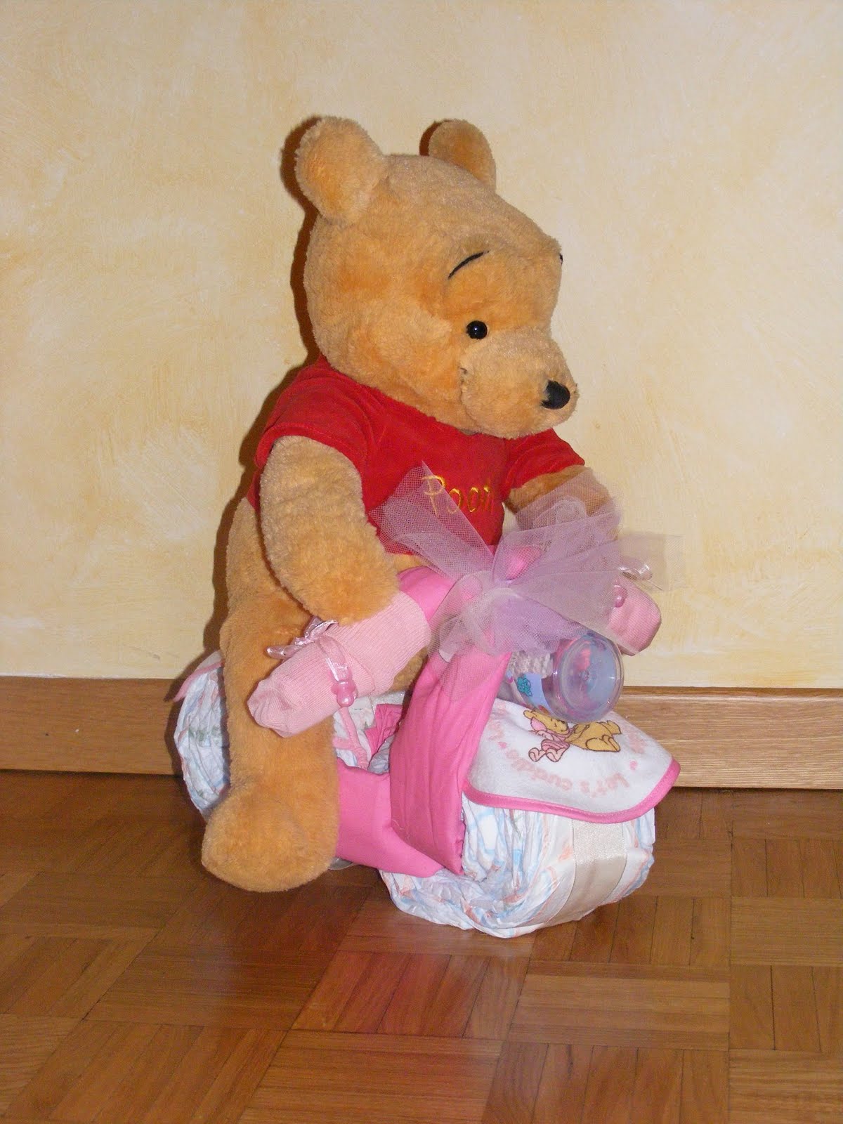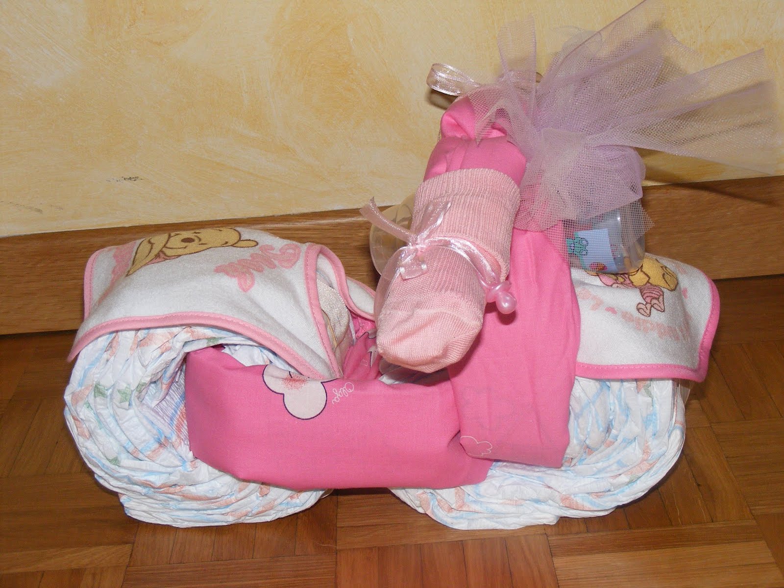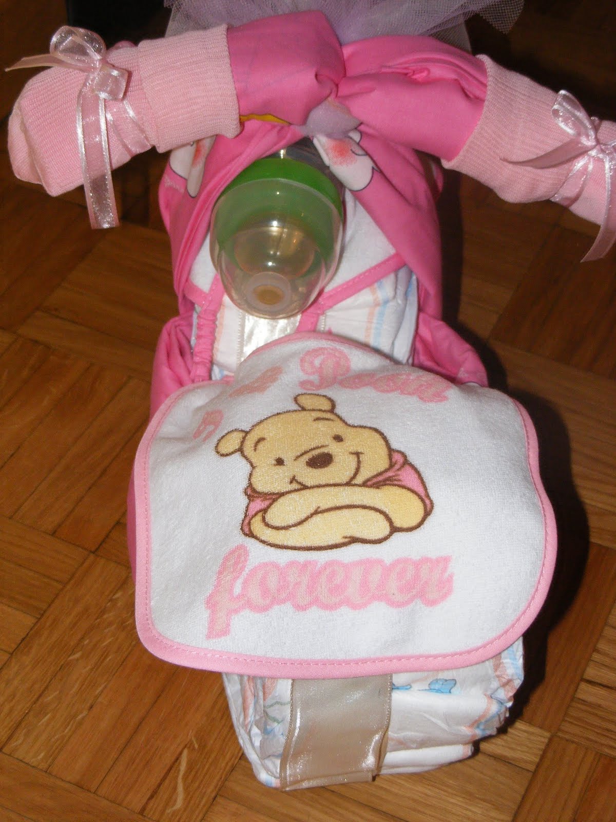 La moto contiene: 20 pannolini (4-8kg), 2 lenzuolini, 1 biberon, 2 bavaglie e 1 paio di calzine!