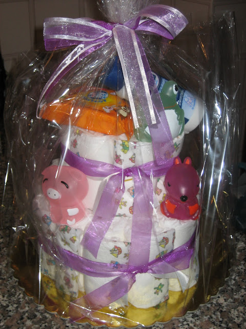 Nella torta ci sono: 26 pannolini 8-18Kg, 3 simpatici animaletti per giocare, salviettine e un flacone di talco per il cambio!!