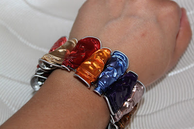Il bracciale è elasticizzatoe le capsule sono avvolte su se stesse a formare dei coni....