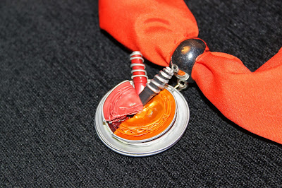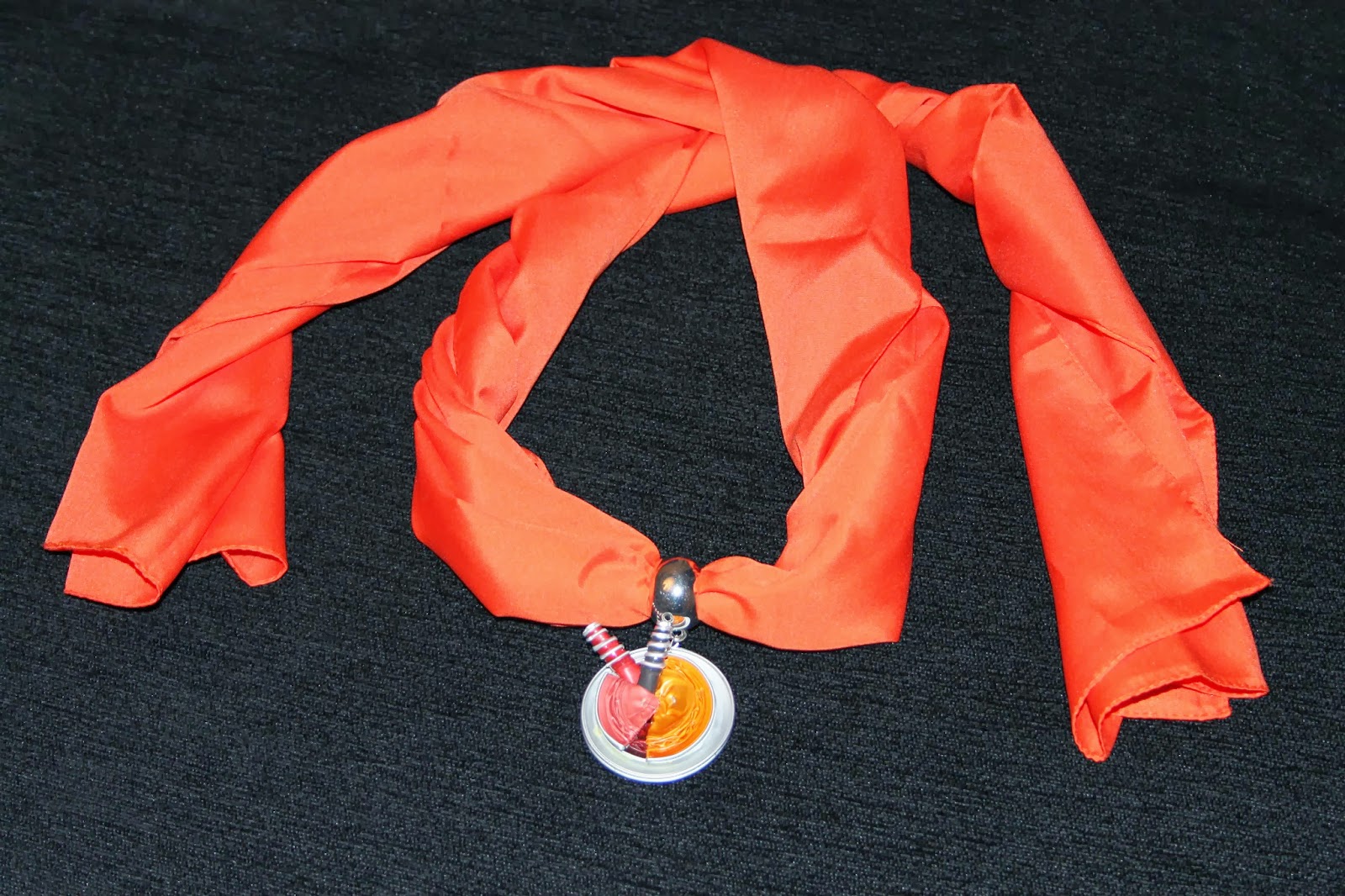 Qui vi mostro la prima versione con foulard in arancio e il ciondolo in coordinato con capsule Nespresso piegate e avvolte a spirale......