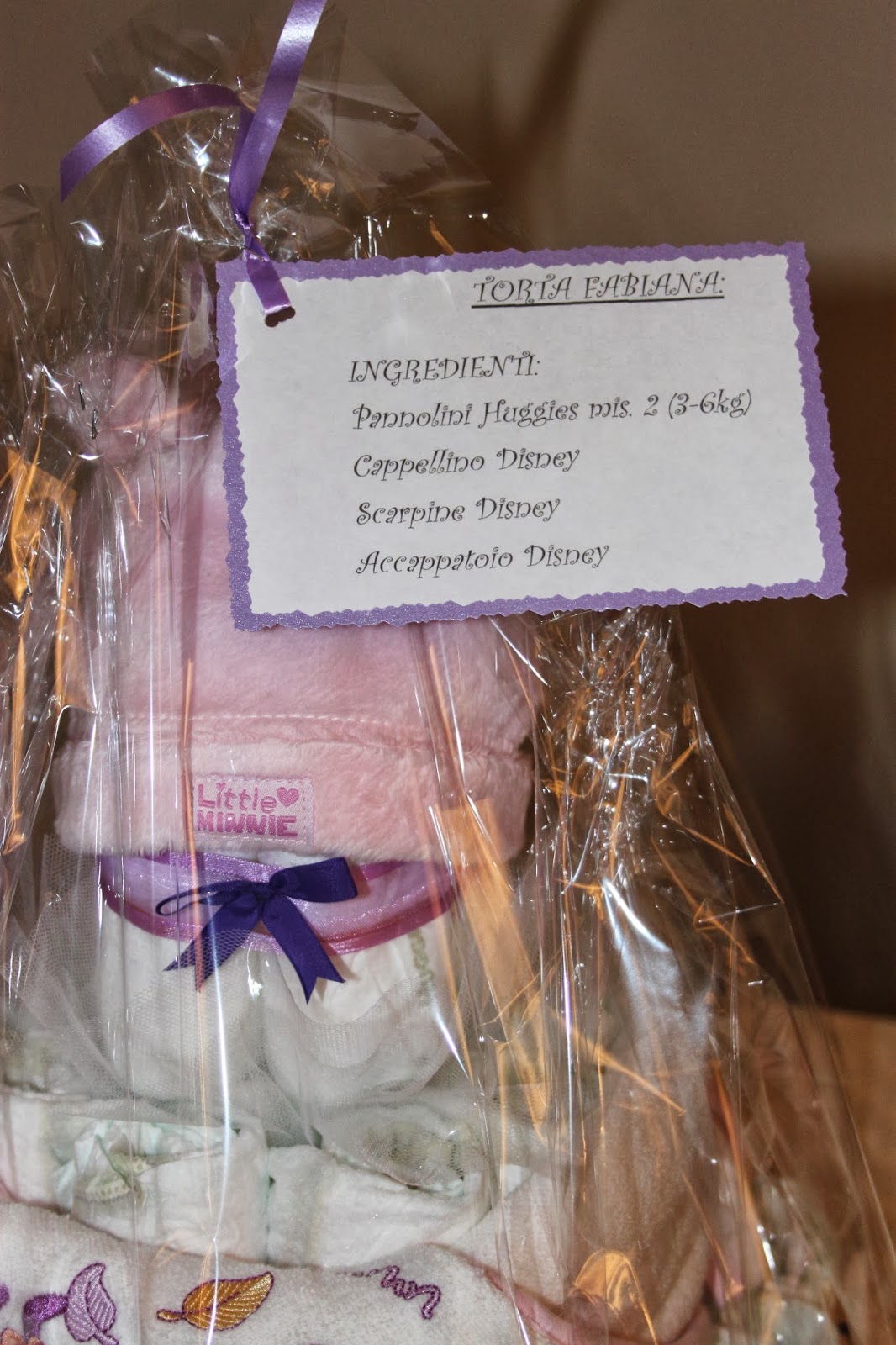 Per la piccola Fabiana abbiamo preparato questa torta di pannolini tutta sui toni del rosa e del viola come richiesto! La neo-zia ha voluto inserire nella torta un cappellino, delle scarpine e un accappatoio Disney oltre ovviamente ad una montagna di pannoliniiiiiiii!!!!!